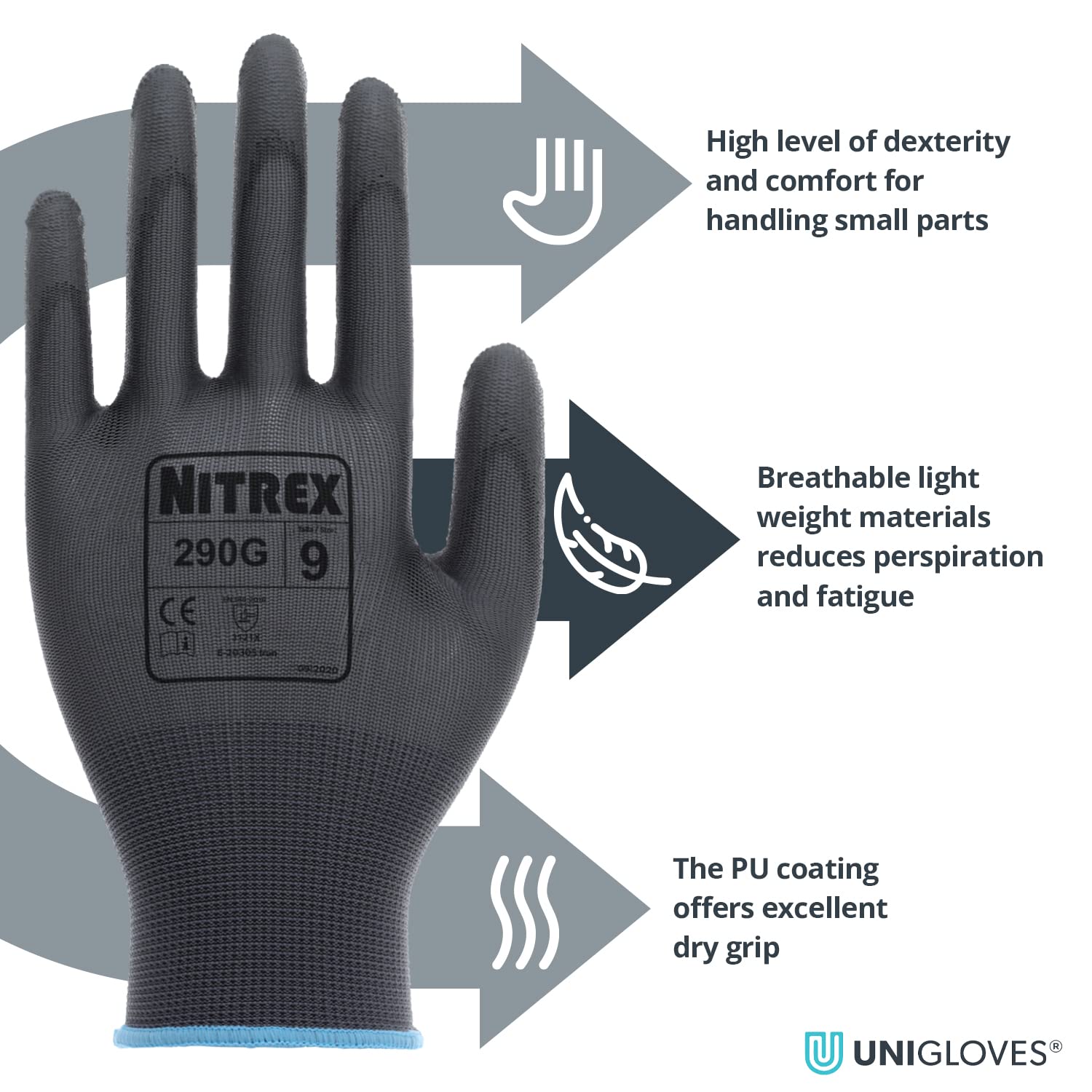 - Includes: 10 pairs of Unigloves Nitrex 290G General Handling Gloves, featuring a polyurethane palm coating and a close-fit design for enhanced dexterity, in grey, size 7.